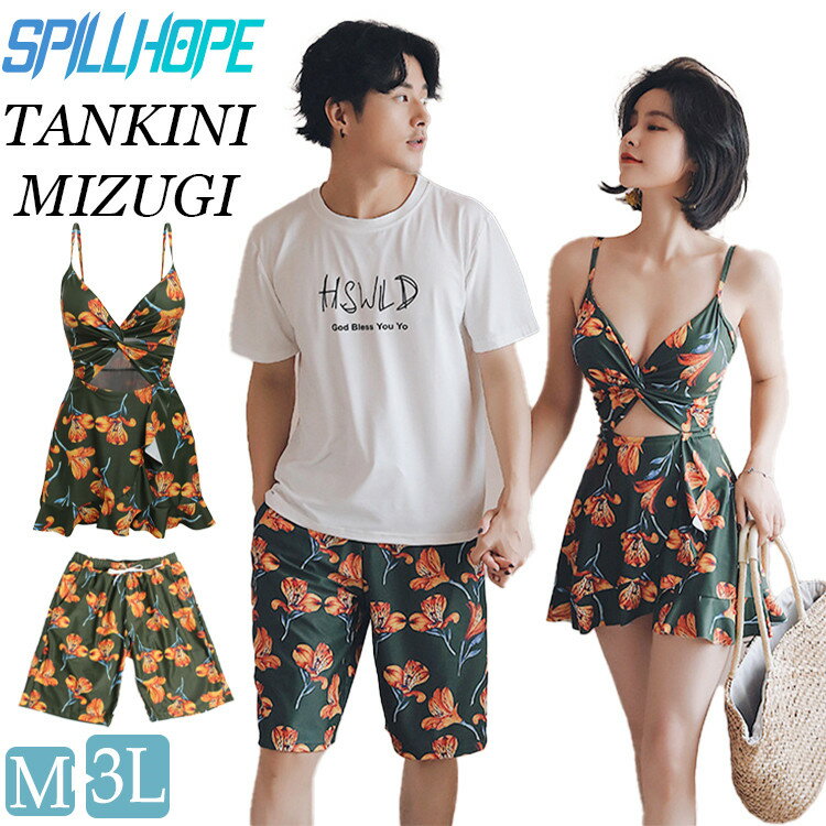花柄 緑色 レディース水着 メンズ水着 カップル水着 夏 ペア水着 2点セット ワンピース水着 ビーチパンツ セクシー 日焼け防止 体型カバー カップル ご夫婦 恋人 彼女 男女2着 新婚旅行 海 ビーチ プール 温泉 セパレート ワンピース ショートパンツ レディース メンズ 旅行