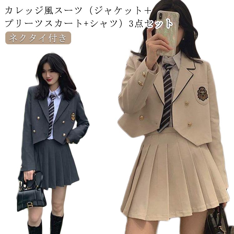 カレッジ風スーツ(ジャケット+プリーツスカート+シャツ)3点セット ネクタイ付き春、夏、秋に着用できます入学シーズン、卒業式、コスプレなどのアクティビティに適しています。