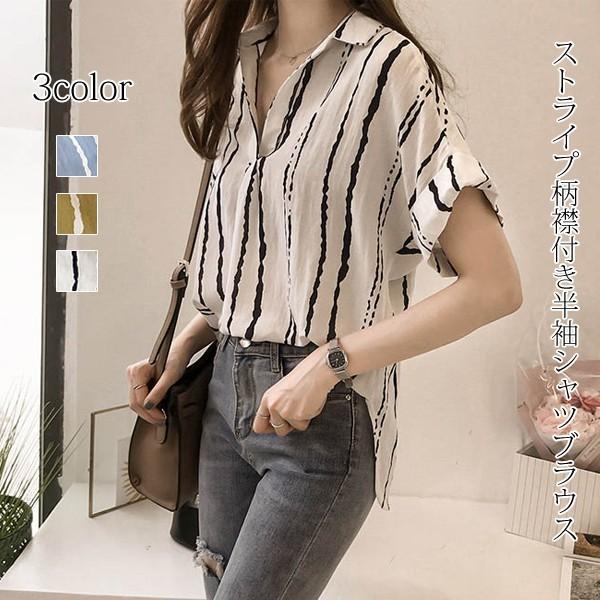 シャツブラウス ストライプ柄 襟付き ゆったり 半袖ドルマン ドロップショルダー シフォン チュニックレディース トップス キレイめ おしゃれ シンプル 20代 30代 40代