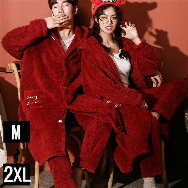 ルームウェア もこもこ ペアパジャマ ナイトガウン レディース パジャマ 前開き 冬 長袖 パジャマ 寝巻き カップル 裏起毛 メンズ パジャマ 可愛い 部屋着 お揃いペア 結婚祝い プレゼント 暖かい ワインレッドdh212d3d3x1