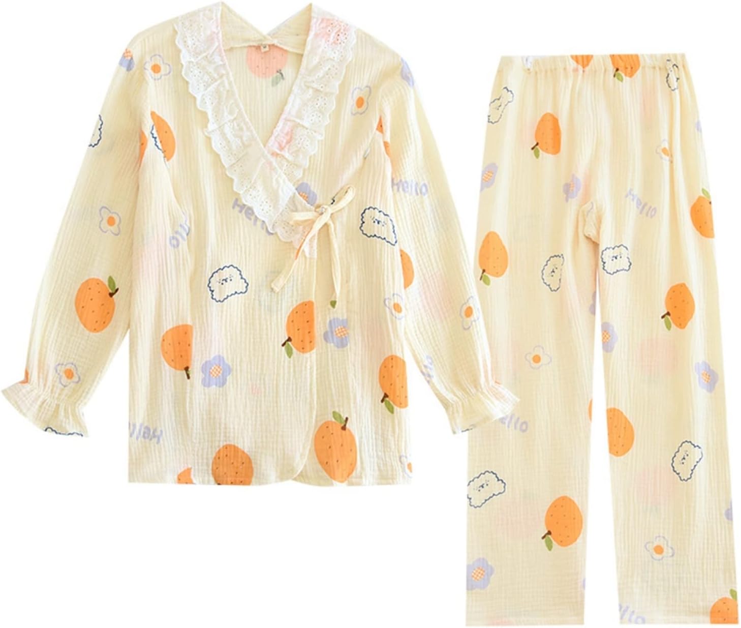 マタニティ パジャマ 春秋 レディース 妊婦 ルームウェア 長袖 コットンガーゼ 可愛い フリル 斜め開き 和式 授乳服 授乳口付き 妊婦服 2点セット 調整可ウエスト キレイめ ゆったり 部屋着 通