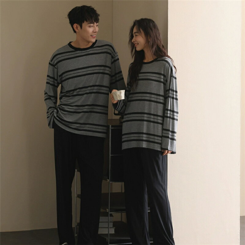 ペア パジャマ 長袖 男女2着 セット カップル 春 秋 ニット 長袖トップス? ストライプ ルームウェア クルーネック 綿 ポリエステル 冬 ペアパジャマ 結婚祝い プレゼント お祝い おもしろ 部屋着 春秋 夫婦 ギフト 上下セット レディース メンズ